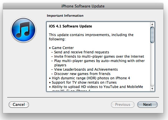 Today Apple unveiled their iOS 4.1 update for all relevant iPhones (i4/3GS/3G). The new update brings a fix to the proximity sensor bug/performances issues, along with bringing HDR (High Dynamic Range) photo capability, Game Center now built-in, upload HD video via Wi-Fi. The iOS 4.1 brings FaceTime support with the new iPod Touch. All you gotta do is link up your iPhone to your iTunes to get updated…unless yours is jailbroken then you may not want to then.