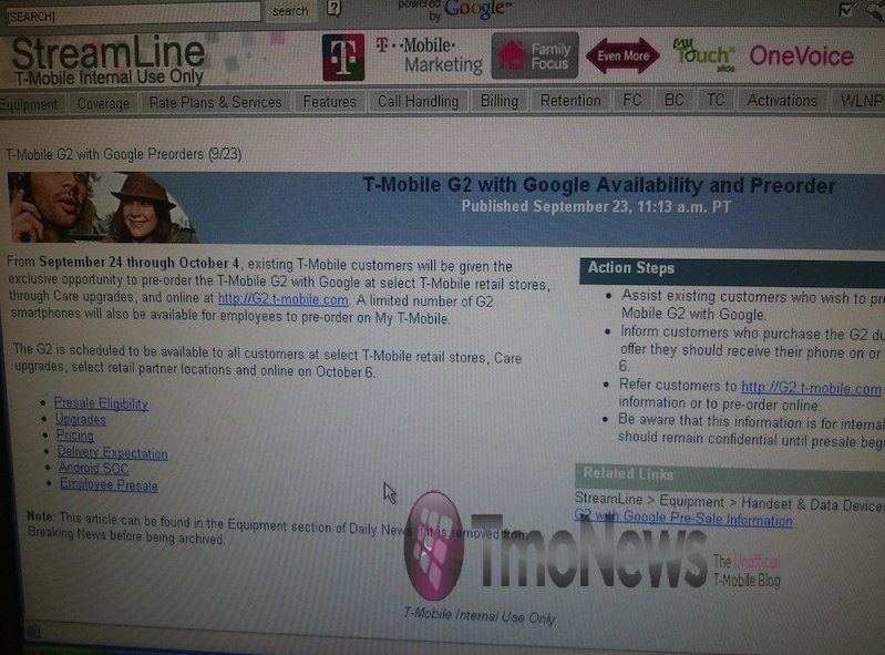 Tmonews is on top of the all of the T-Mobile G2 news. They are reporting that official pre-orders for existing T-Mobile customers kick off on tomorrow, September 24th, and ends on October 4th. The official release date for the HSPA+-capable, G2 is slated for October 6th for everyone. With that said you may wanna check your current upgrade status to see if interested buyers can take advantage of the pre-order.   Check out www.G2.t-mobile.com tomorrow to get started.