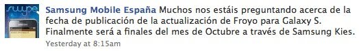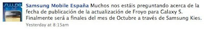 Spotted on Samsung Mobile Spanish division’s Facebook page, stating that the long-awaited Android 2.2 update for all Galaxy S devices won’t make its rounds until late October.   Definitely a delay from the previous date of arrival, which was supposed to be September, and will piss a few Galaxy S owners off which this news.   Now the real question is does this apply only to the original Euro Galaxy S? And if not, how long will the four US variants have to wait for their turn at bat?   We will keep you posted as more information develops.