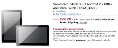 ViewSonic’s Android 2.2-powered, 7inch tablet is now ready for the interested to reserve theirs. Although the specs read as an under powered Galaxy Tab with its 600MHz processor, it does have phone capabilities without any hacks needed though. Pre-orders are available through Amazon for $599.99 (the same price as the Galaxy Tab at full retail pricing) although the press release mentioned pricing at $479. I wonder will the price point turn off consumers to it like the Tab is doing. However, the pre-order link lies below.
